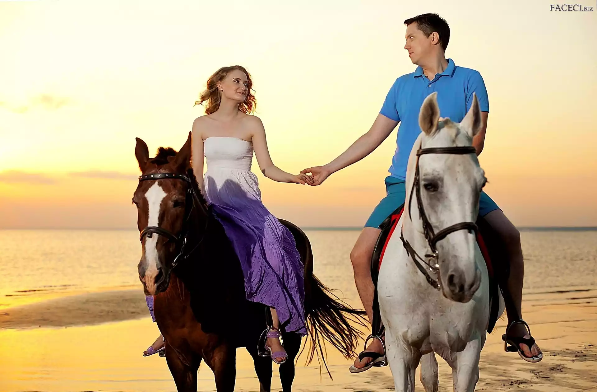 Plaża, Morze, Mężczyzna, Kobieta, Konie - faceci.biz
